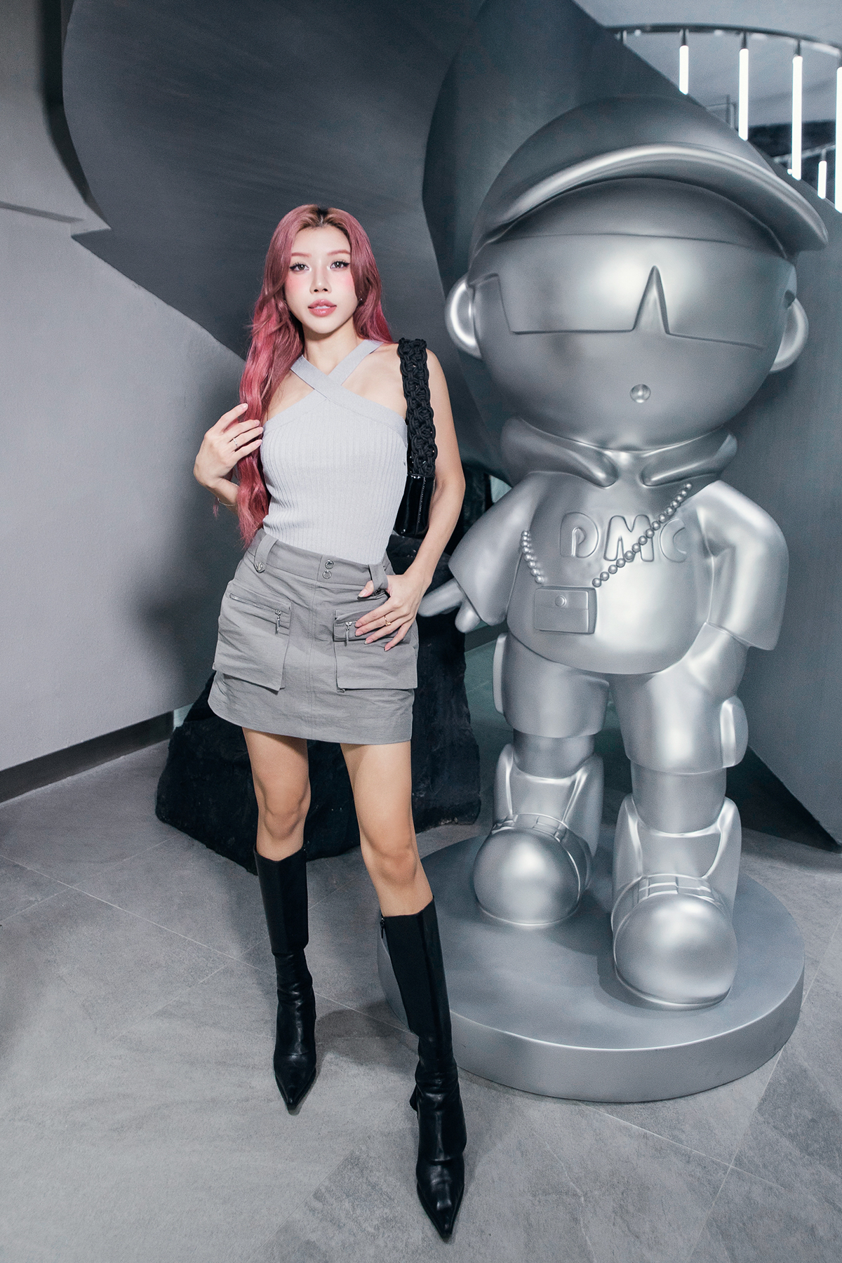 Ninh Dương Lan Ngọc là “nàng thơ” được NTK Đỗ Mạnh Cường yêu thích trong nhiều năm qua. Nữ diễn viên điện ảnh danh tiếng diện váy ngắn trên gối, phối áo trễ vai, mang giày boots, kết hợp vòng cổ chocker, túi đeo.