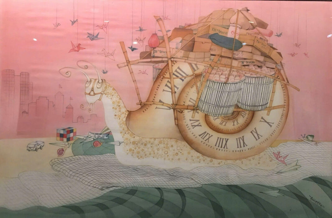Trong tranh, nước không chỉ là chất liệu hay kỹ thuật, mà là ký ức, là nhịp thở của sự sống. Nước loang trong mực, tan trong màu, thấm vào lụa, để lại những vệt mờ mong manh, gợi cảm giác về thời gian, sự chảy trôi và lưu giữ. Những hình ảnh quen thuộc của làng quê Việt Nam hiện lên qua gợi mở, để người xem tự kết nối với trải nghiệm và ký ức của chính mình.