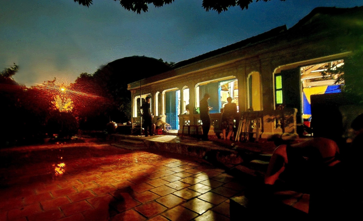 Ngôi nhà im lìm trong không gian của buổi hoàng hôn vừa tới với bầu trời xanh tuyệt đẹp. Đoàn phim cũng vừa xong buổi cơm chiều đạm bạc, chỉ nghỉ ngơi tầm 30 phút là lệnh quay đã được đạo diễn Xuân Phước ban ra. Cảnh quay nội đêm về đôi tình nhân trai giang hồ trí thức (Thanh Duy) và gái tứ chiến (NSUT Kim Tuyến) trong một gian phòng được bày binh bố trận hơn 2 tiếng đồng hồ vì phải canh ánh sáng về đêm sao cho chân thật nhất. Đặc biệt, mền mùng, chiếu gối phải thật là xưa thì mới đúng với cảnh quay yêu cầu.