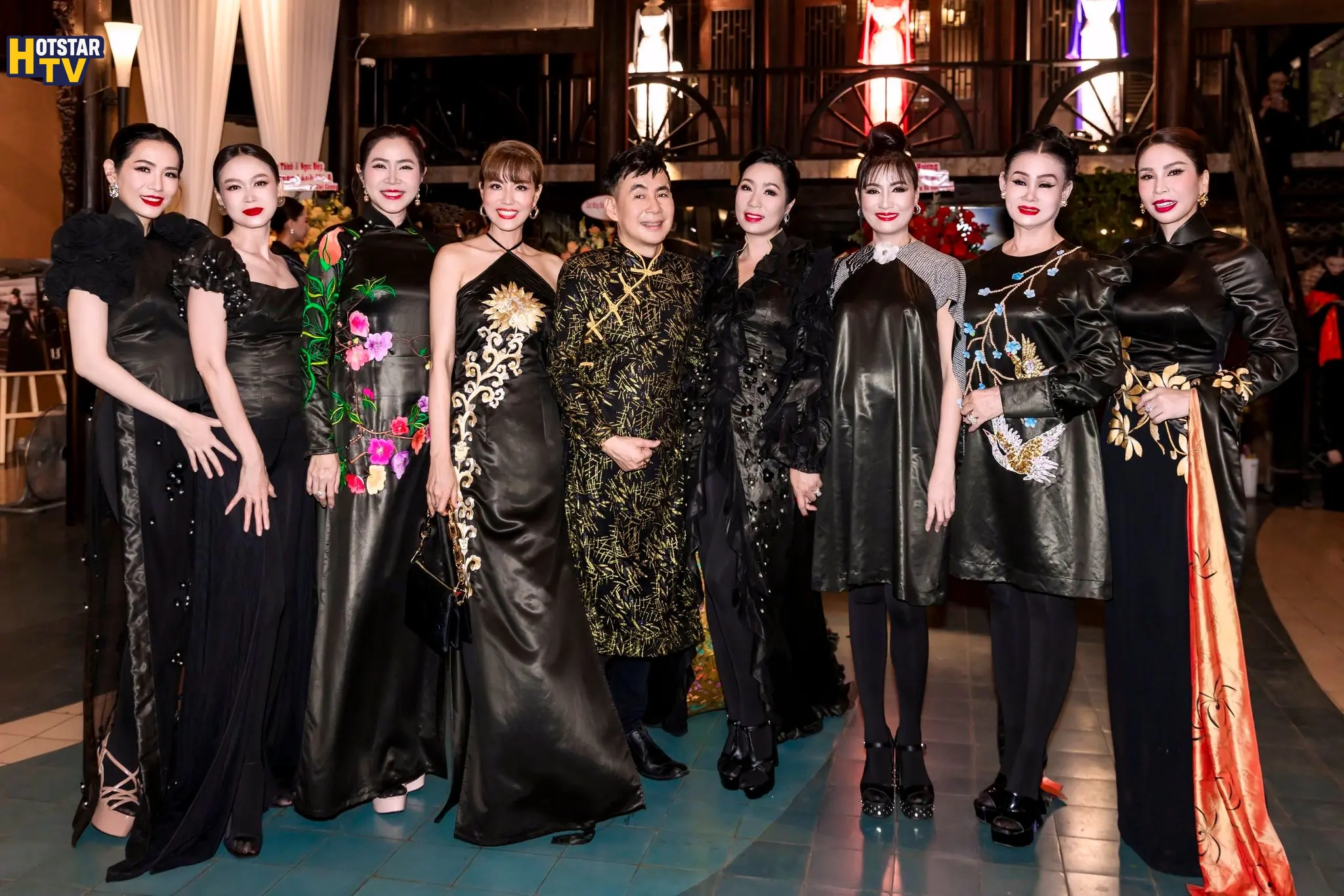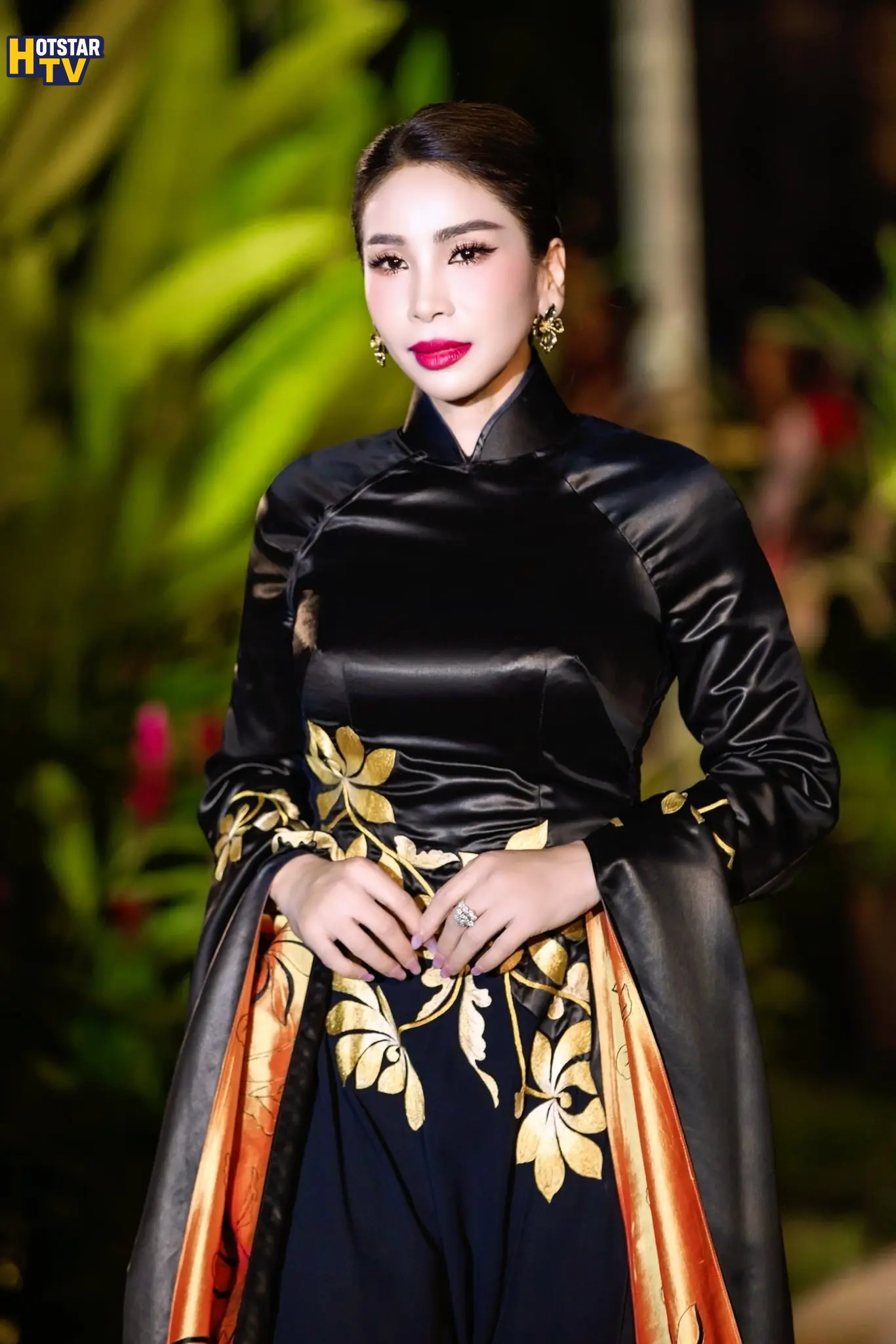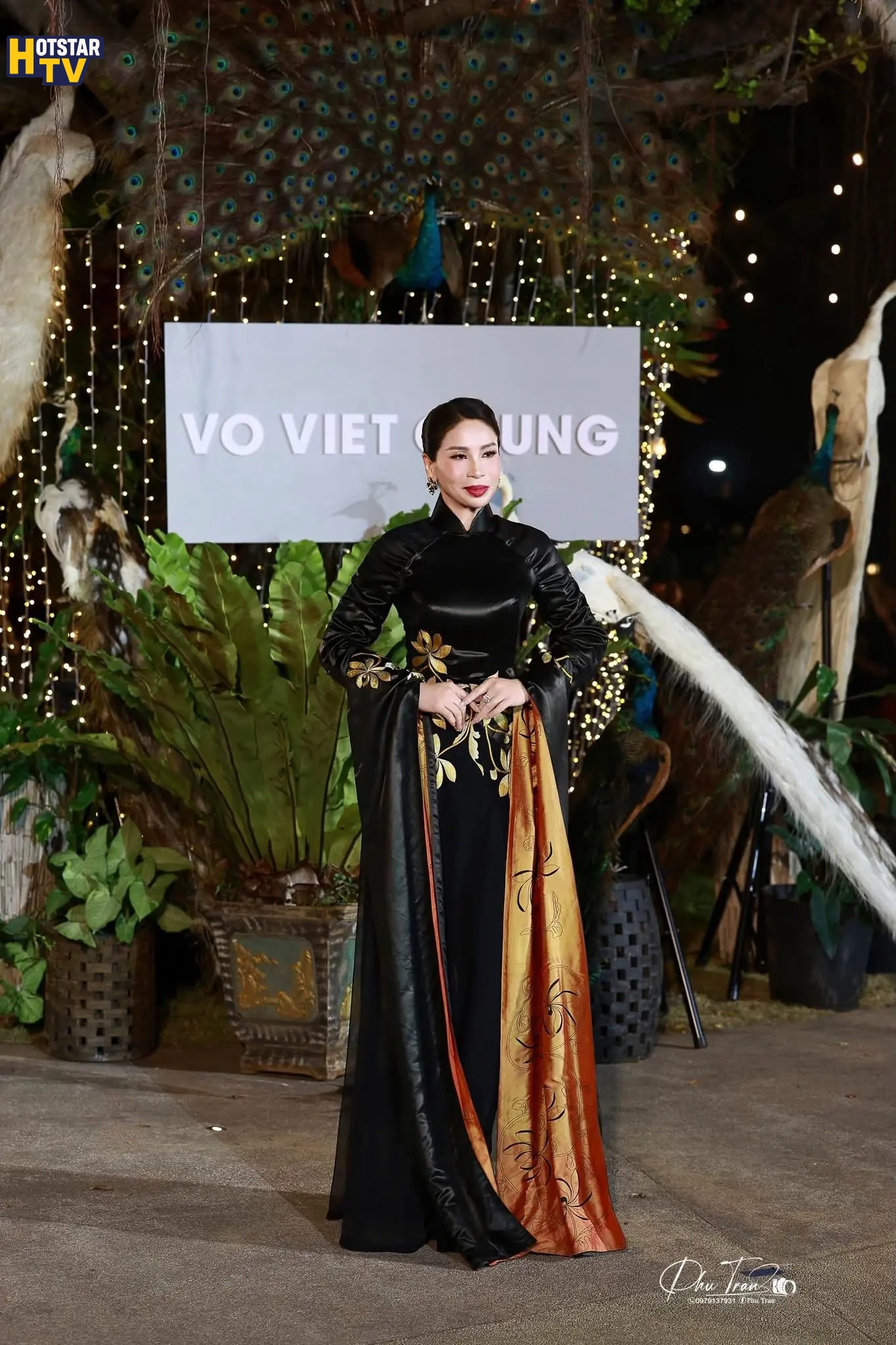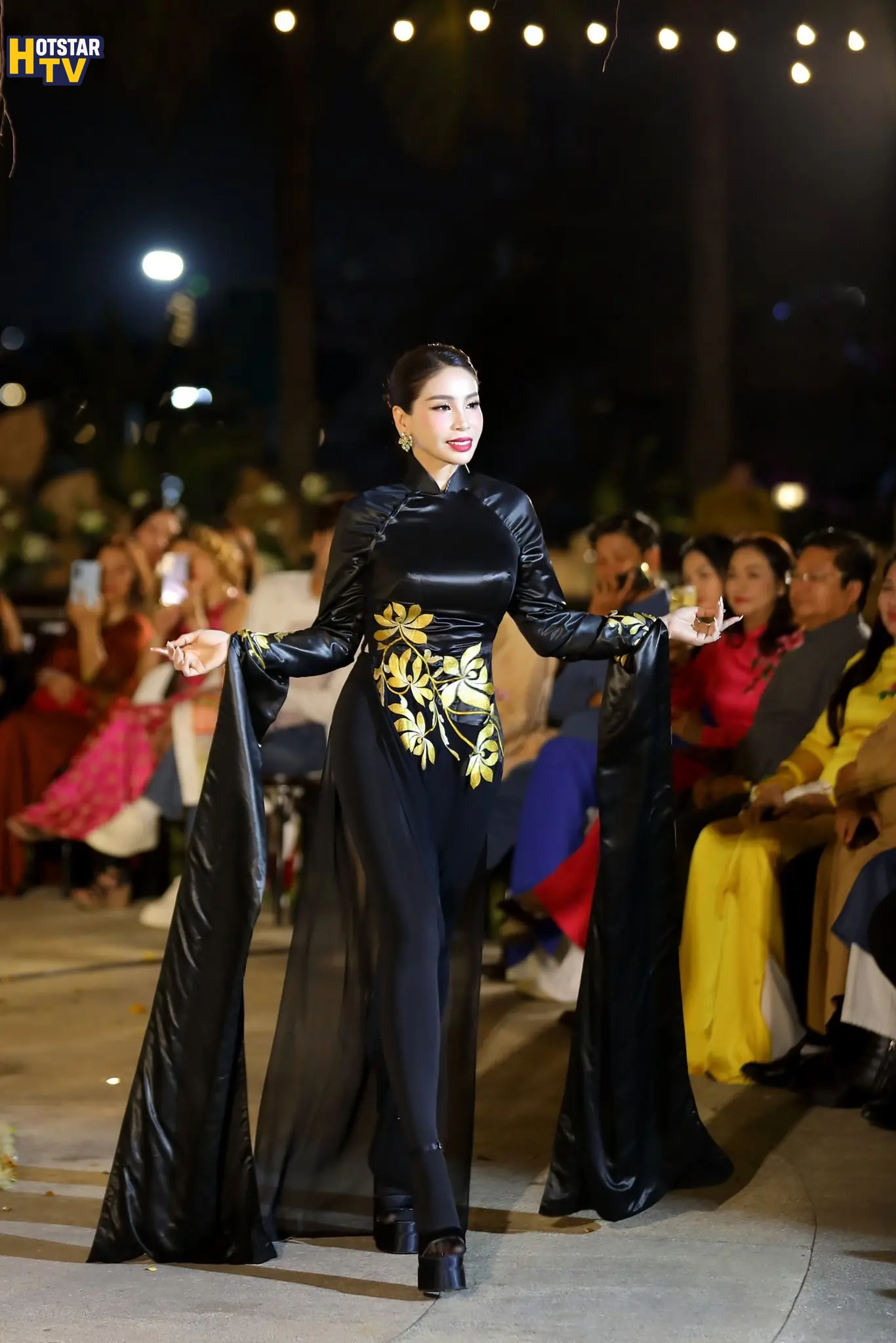 Diễn viên Lý Hương xuất hiện trong thiết kế áo dài gam đen, điểm xuyết họa tiết ánh vàng tinh tế. Sự kết hợp giữa màu sắc trầm – sáng cùng phom dáng truyền thống tạo nên một tổng thể hài hòa, vừa mang nét cổ điển vừa toát lên vẻ sang trọng, đĩnh đạc.