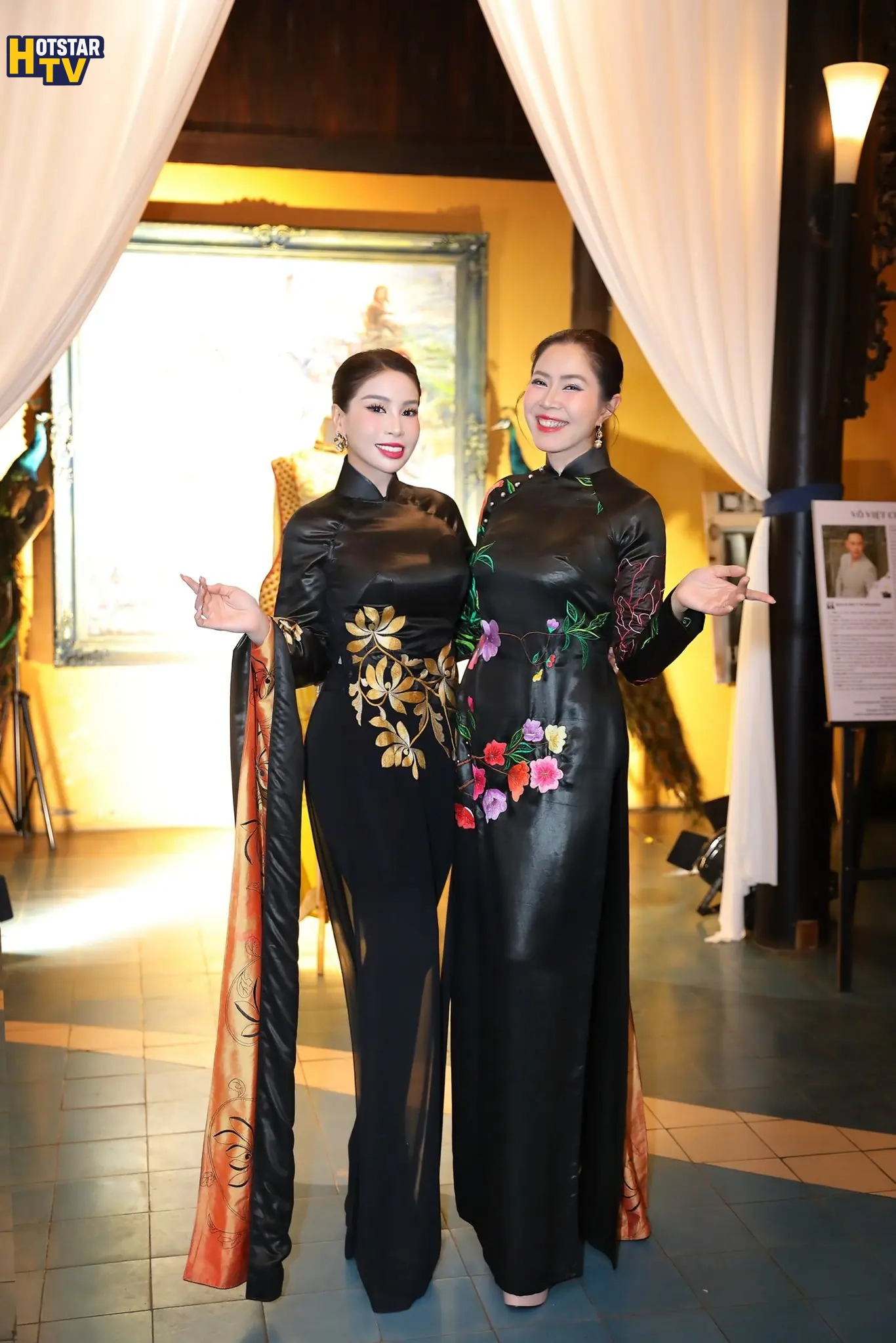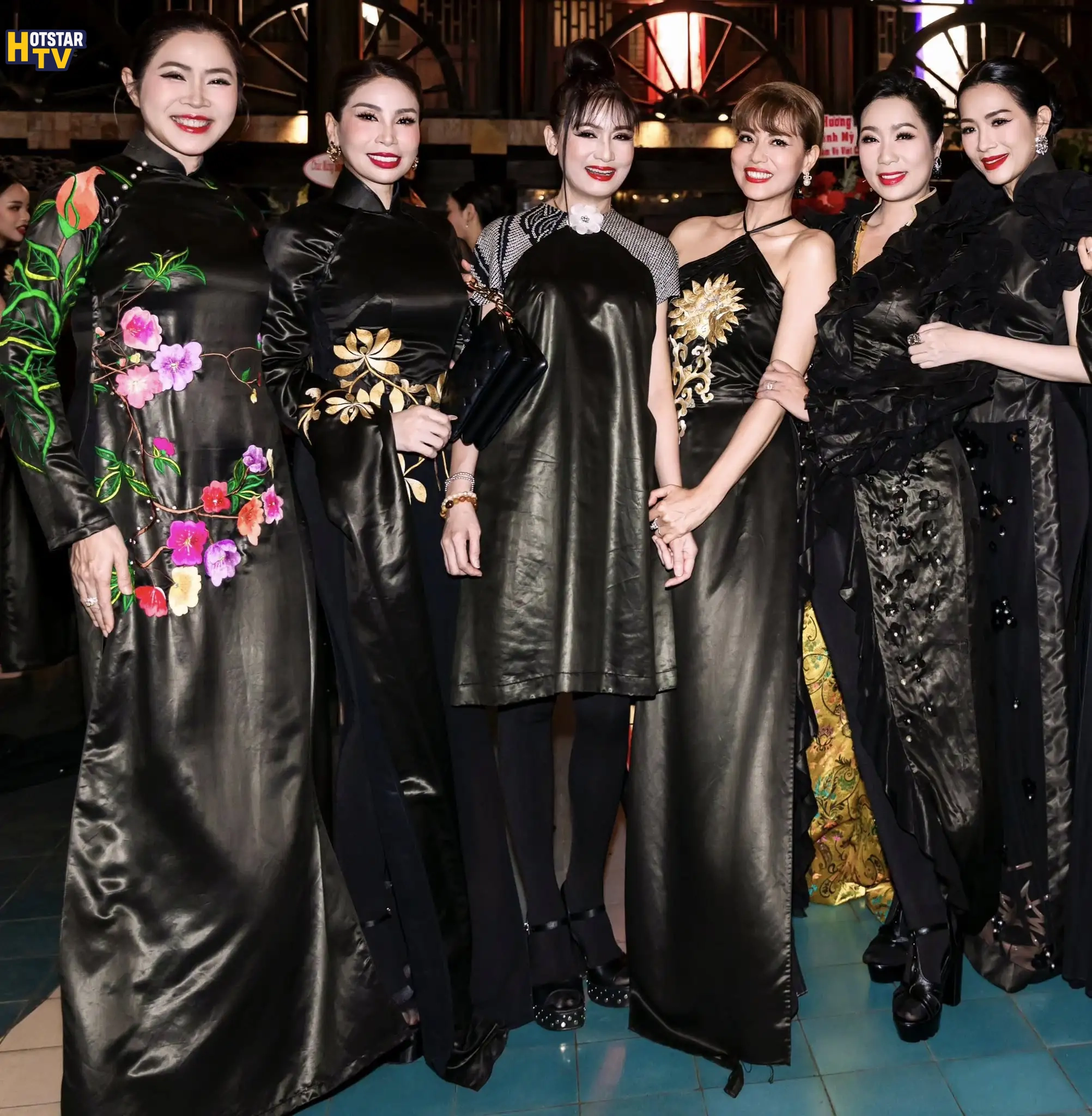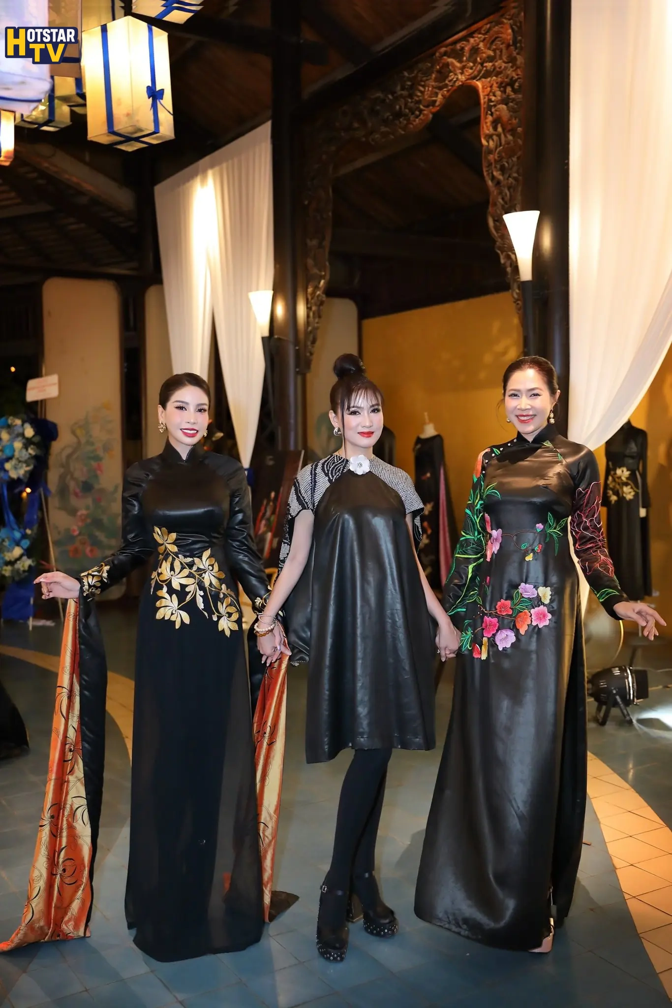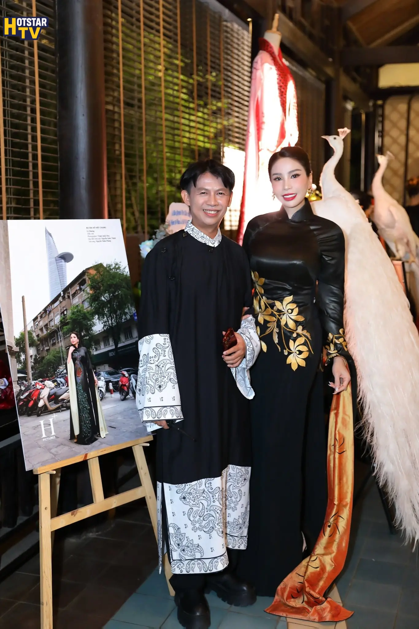 Diễn viên Lý Hương xuất hiện trong thiết kế áo dài gam đen, điểm xuyết họa tiết ánh vàng tinh tế. Sự kết hợp giữa màu sắc trầm – sáng cùng phom dáng truyền thống tạo nên một tổng thể hài hòa, vừa mang nét cổ điển vừa toát lên vẻ sang trọng, đĩnh đạc.